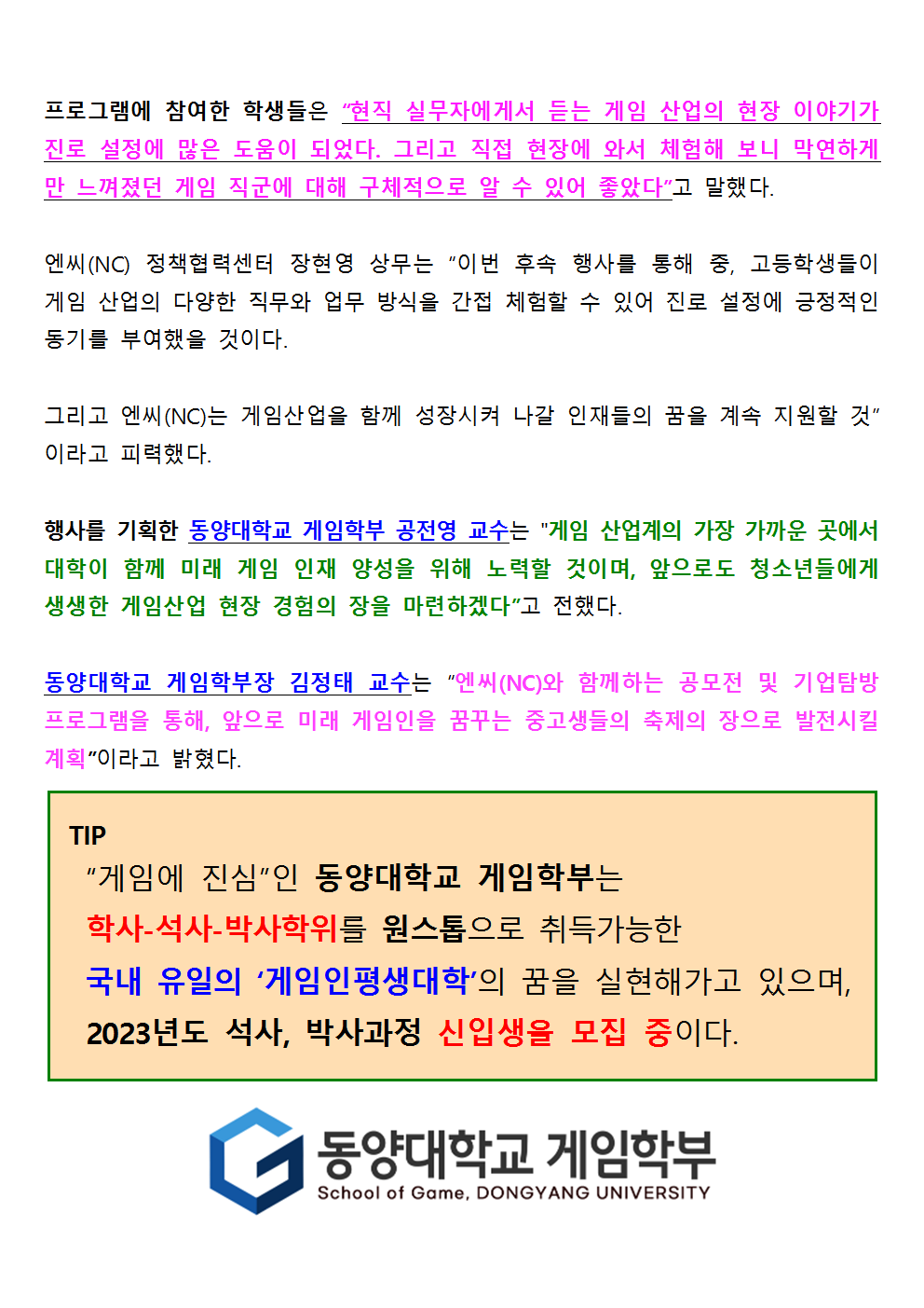 [생생라이브 게시내용] 동양대학교-엔씨(NC), 미래 게임인재 양성 프로그램에 박차002