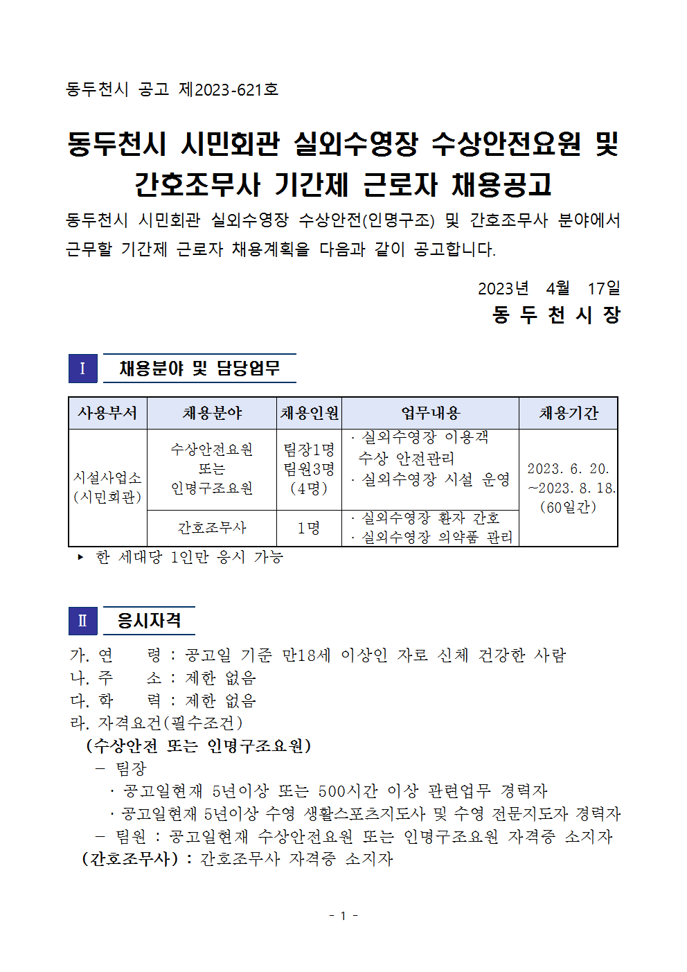 동두천시 시민회관 실외수영장 수상안전요원 및 간호조무사 채용 공고001