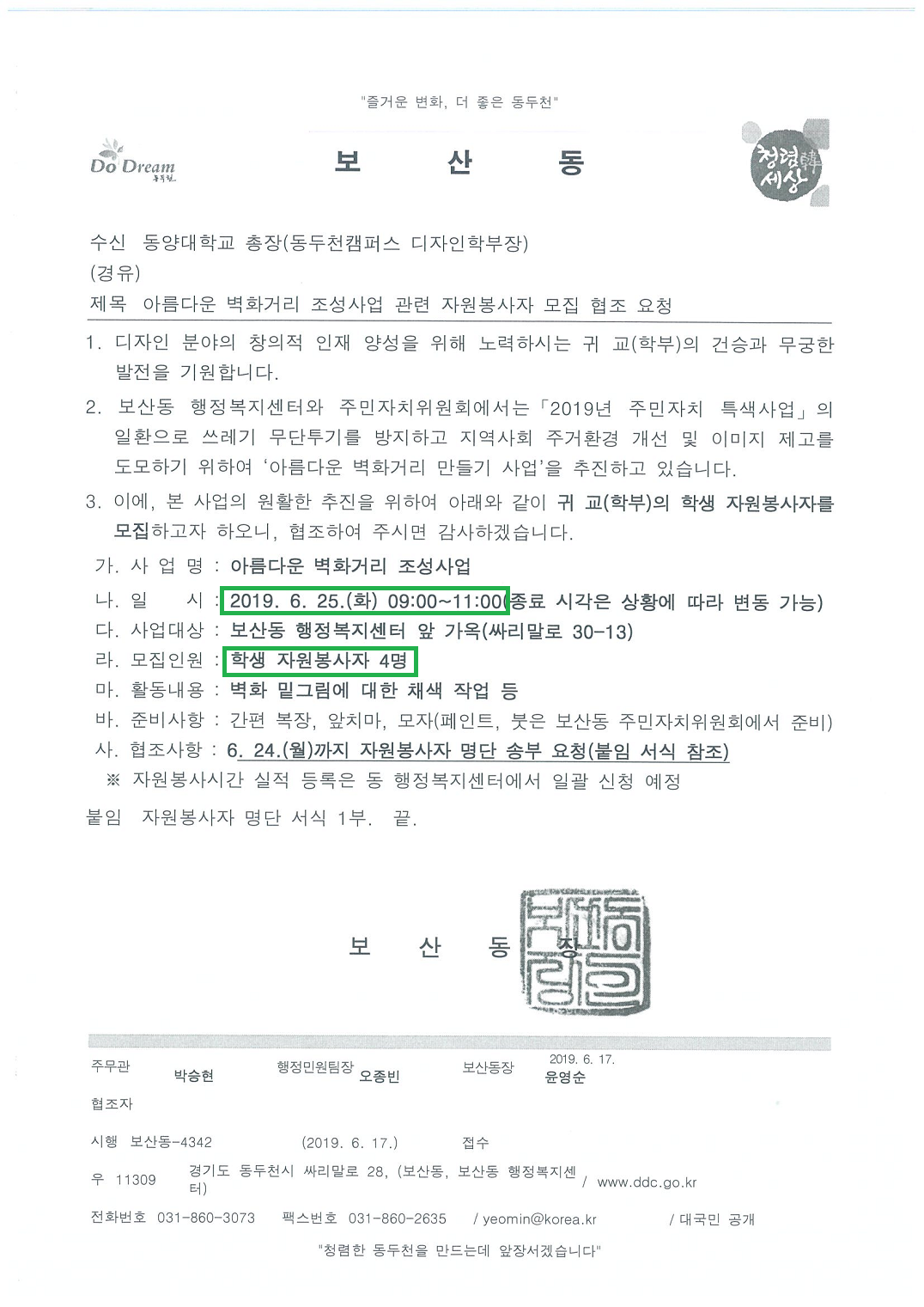 아름다운 벽화거리 조성사업 관련 자원봉사자 모집 협조요청 (동두천시) _
