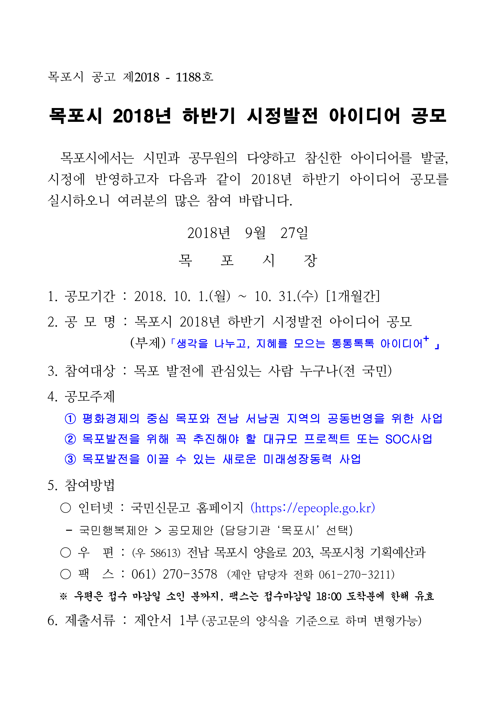 2018 하반기 목포시 시정 아이디어 제안 공모 공고문_1