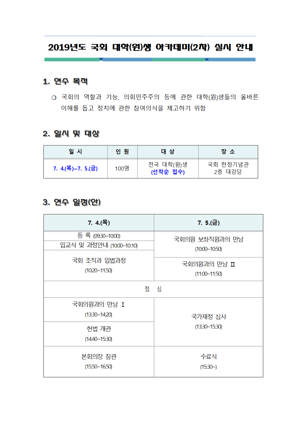 2019년도 국회 대학(원)생 아카데미(2차) 실시 안내001