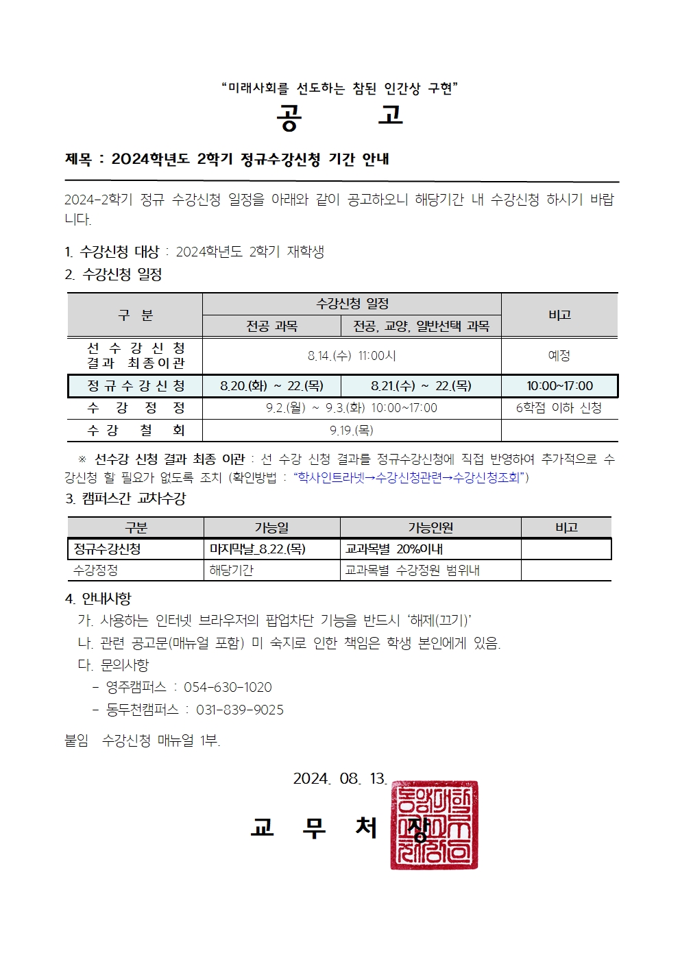 [공고] 2024학년도 2학기 정규 수강신청 안내001