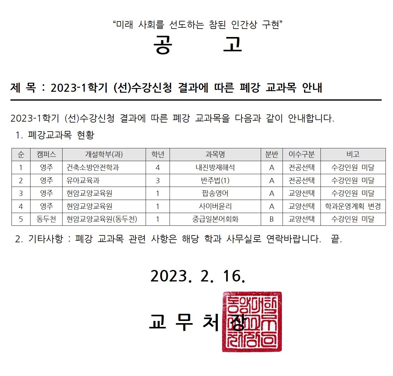 2023-1학기 선수강 결과에 따른 폐강 교과목 안내