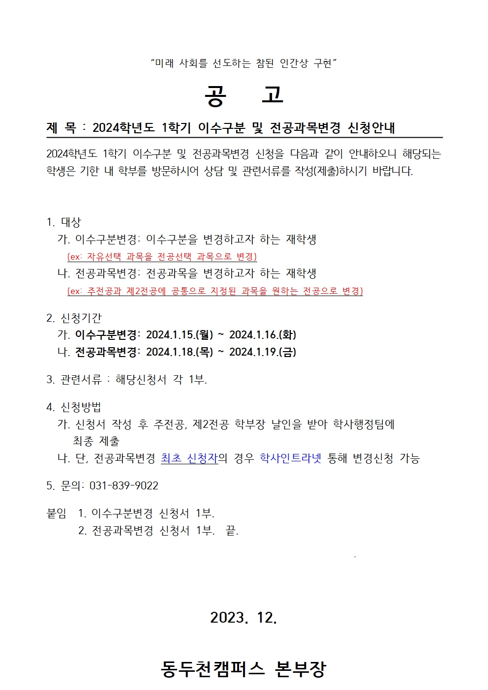 2024학년도 1학기 이수구분 및 전공과목변경 신청 공고문001