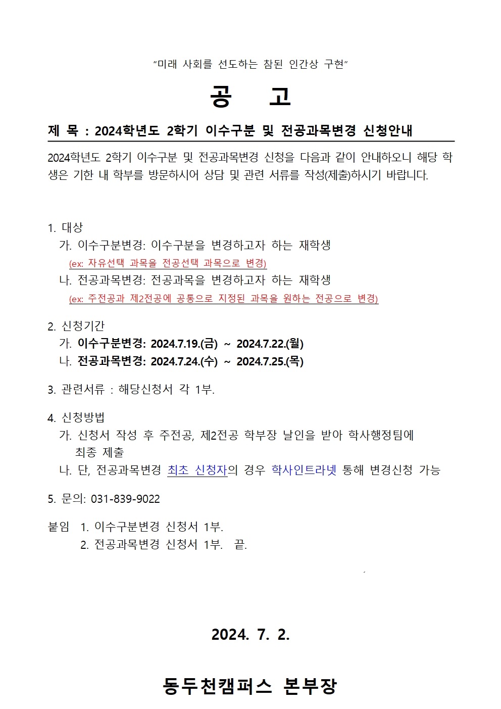 2024학년도 2학기 이수구분 및 전공과목변경 신청 공고문001