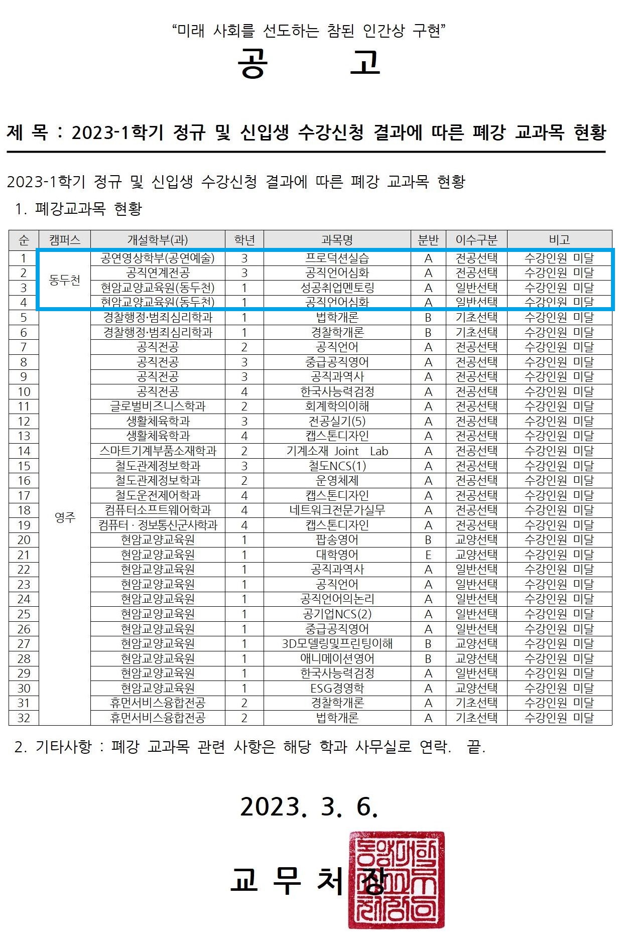 23-1학기 정규 및 신입생 수강신청 결과에 따른 폐강 교과목 안내