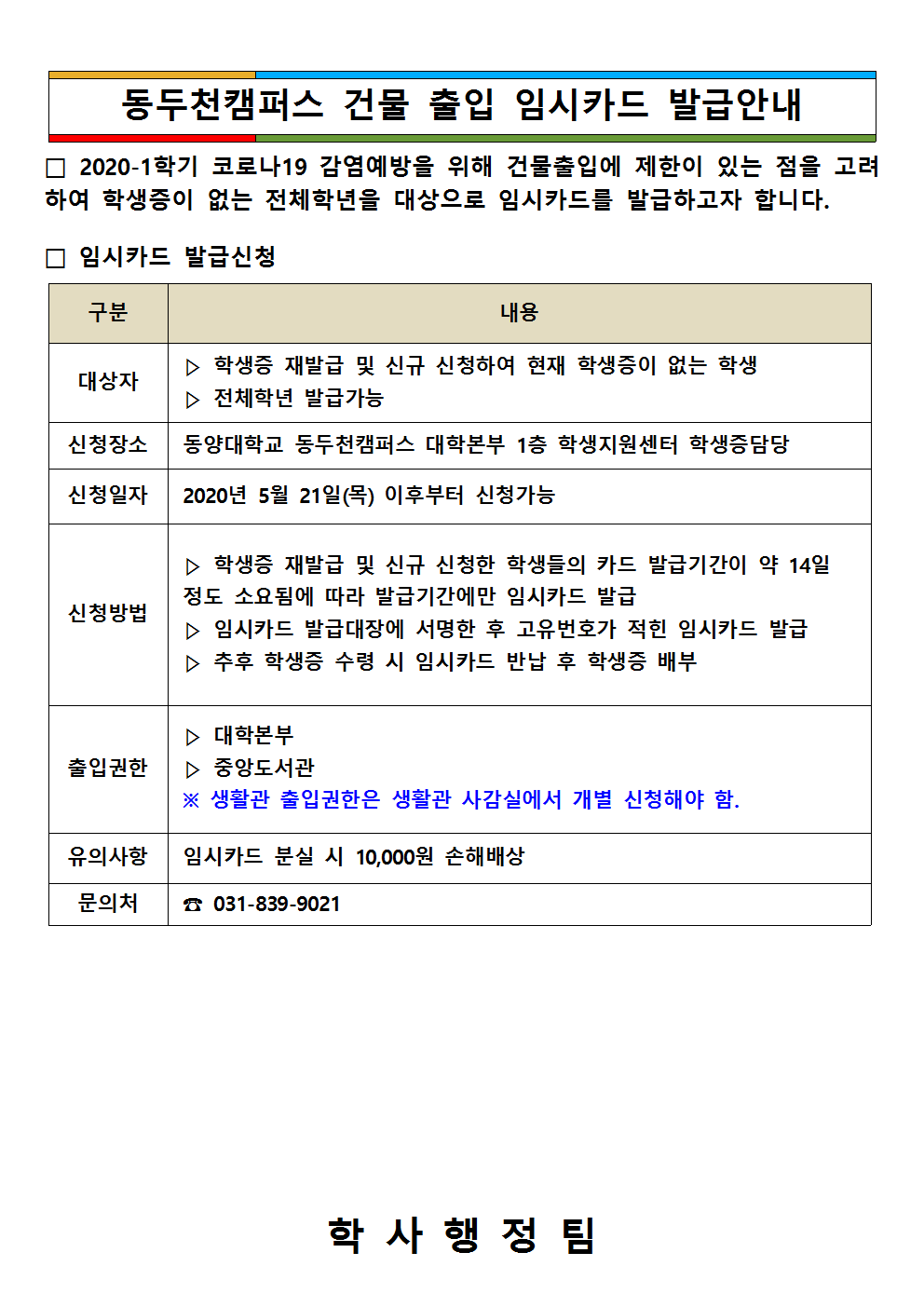 동두천캠퍼스 건물 출입 임시카드 발급안내