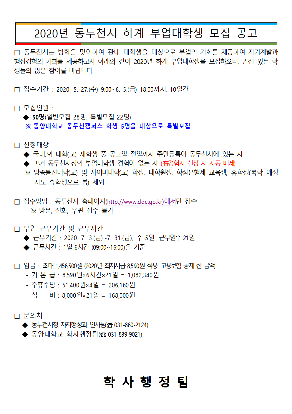 2020년 동두천시 하계 부업대학생 모집 공고001