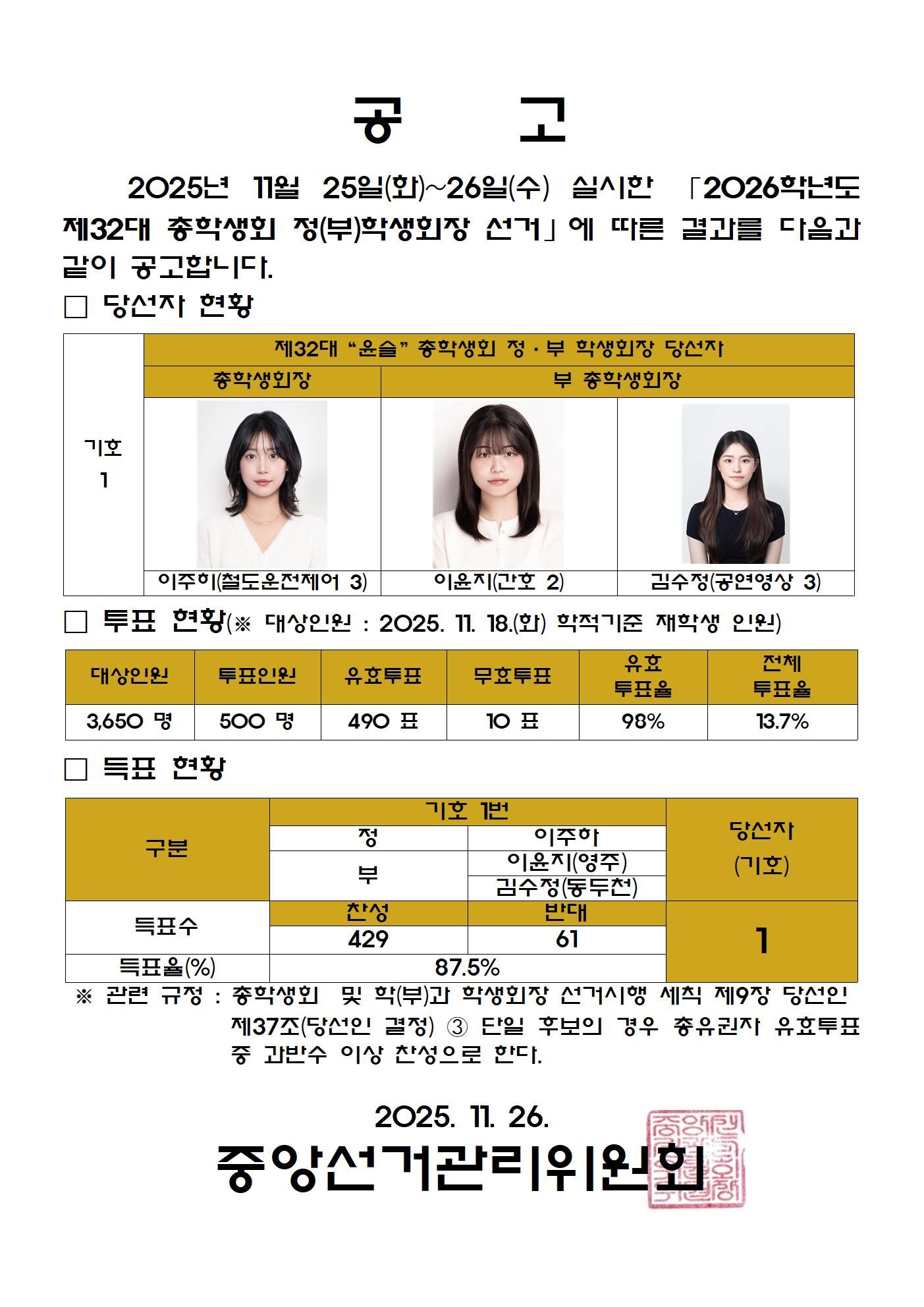 HOME > 동양광장 > 캠퍼스공지 동양광장분실물 인터넷 서비스 DYU생생라이브 학사안내 캠퍼스공지 취창업 프로그램 및 특강안내 장학정보 공모전 정보광장 동영상 갤러리 자유게시판 경기북부연합대학 감염병 관리공지 K-MOOC 캠퍼스공지 게시판 내용 입력 및 파일첨부에 개인정보가 포함될 경우 개인정보가 유출되어 악용될 수 있으니 주의하시기 바랍니다. 제32대 총학생회 정(부) 학생회장 투표결과 작성자 학생팀 작성일 2025-11-27 14:37 조회 131 목록보기 이전 다음