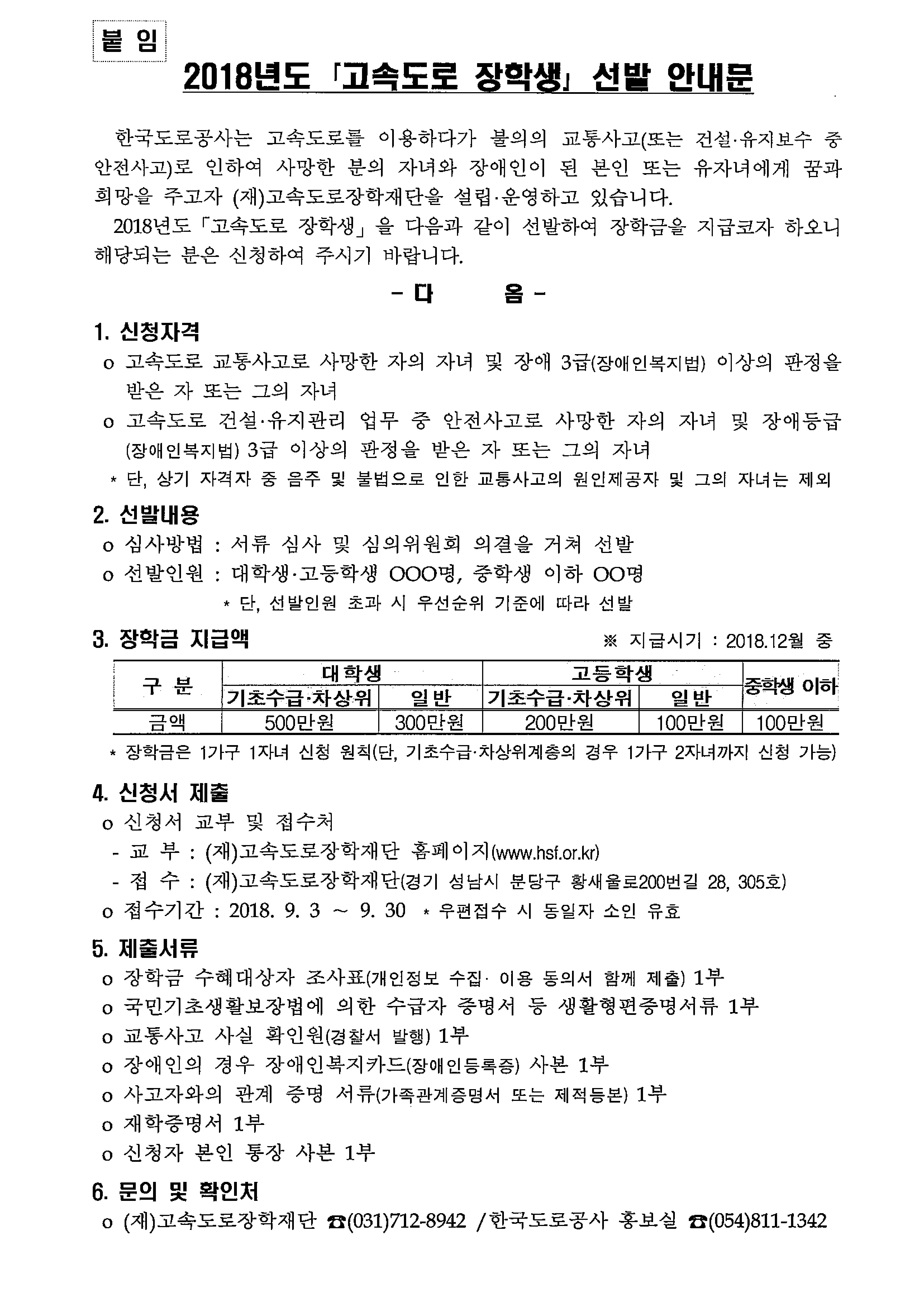 붙임_2018년도 고속도로 장학생 선발 안내문_1