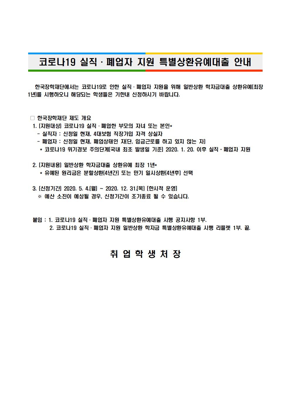 코로나19 실직·폐업자 지원 특별상환유예대출 안내