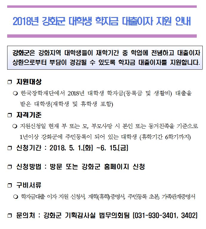2018년 강화군 대학생 학자금 이자지원 홍보 협조