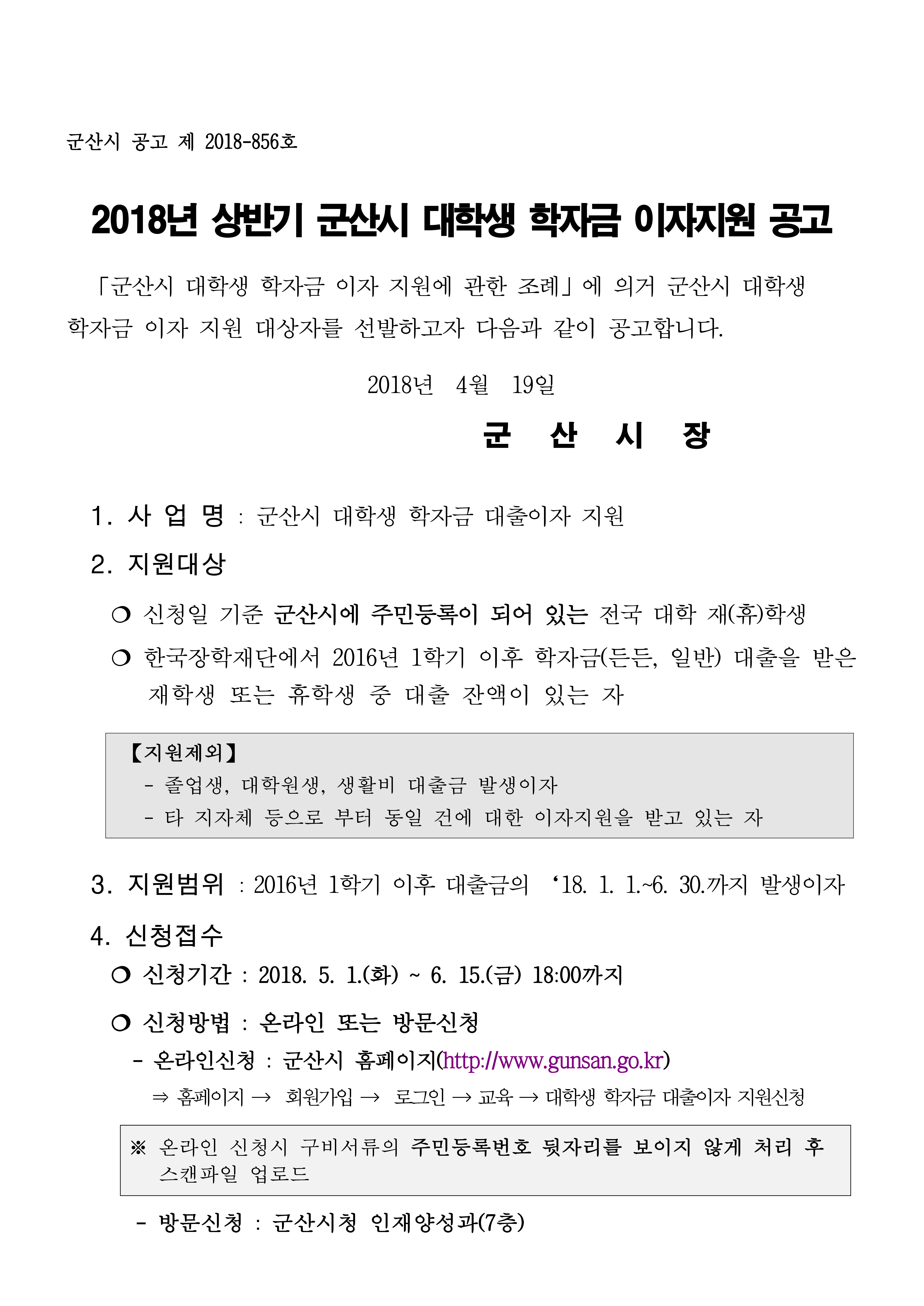 2018년 상반기 대학생 학자금이자 지원사업 공고문_1