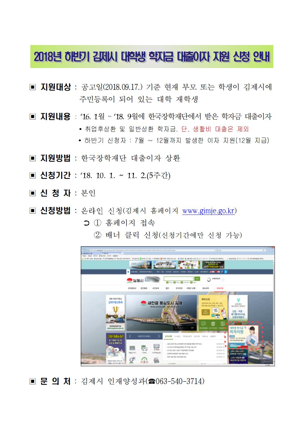 2018하반기 김제시 대학생 학자금 대출이자 지원 신청 안내