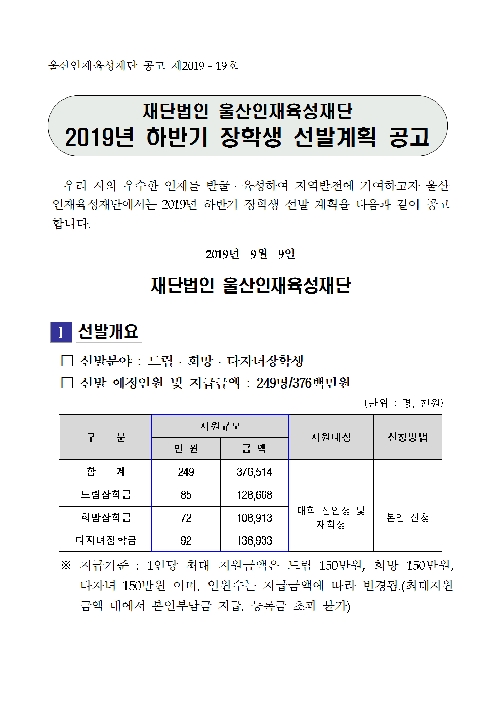 2019년 울산인재육성재단 하반기 장학생 선발 공고문001