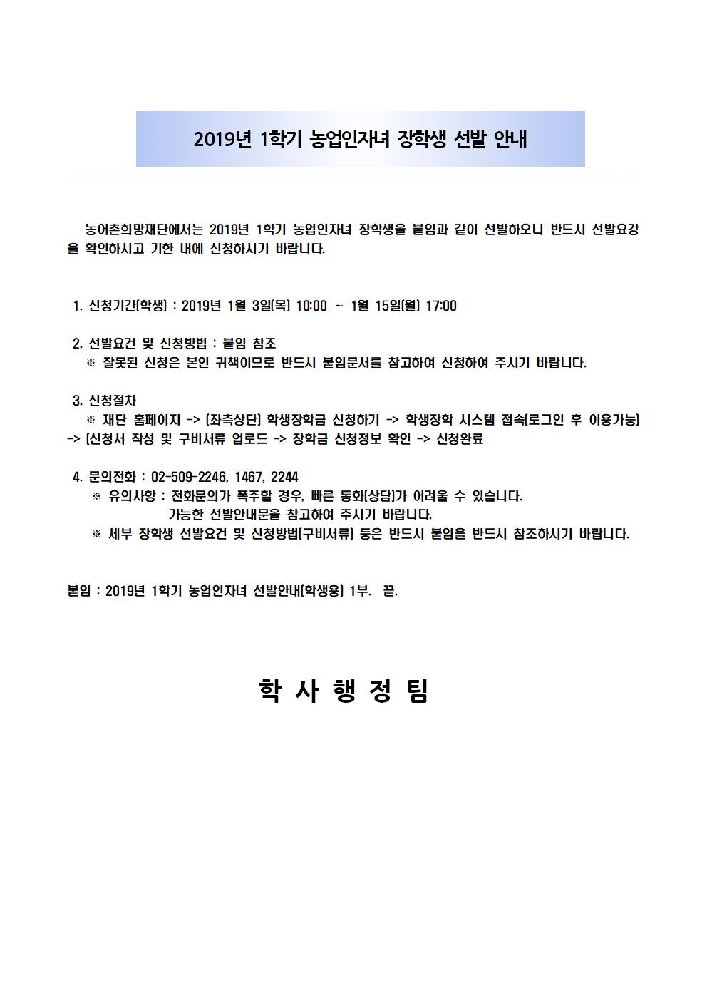 2019년 1학기 농업인 자녀 장학생 선발 안내(표지)