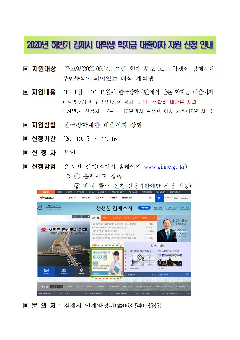 2020년 김제시 하반기 대학생 학자금 대출이자 지원 신청 안내