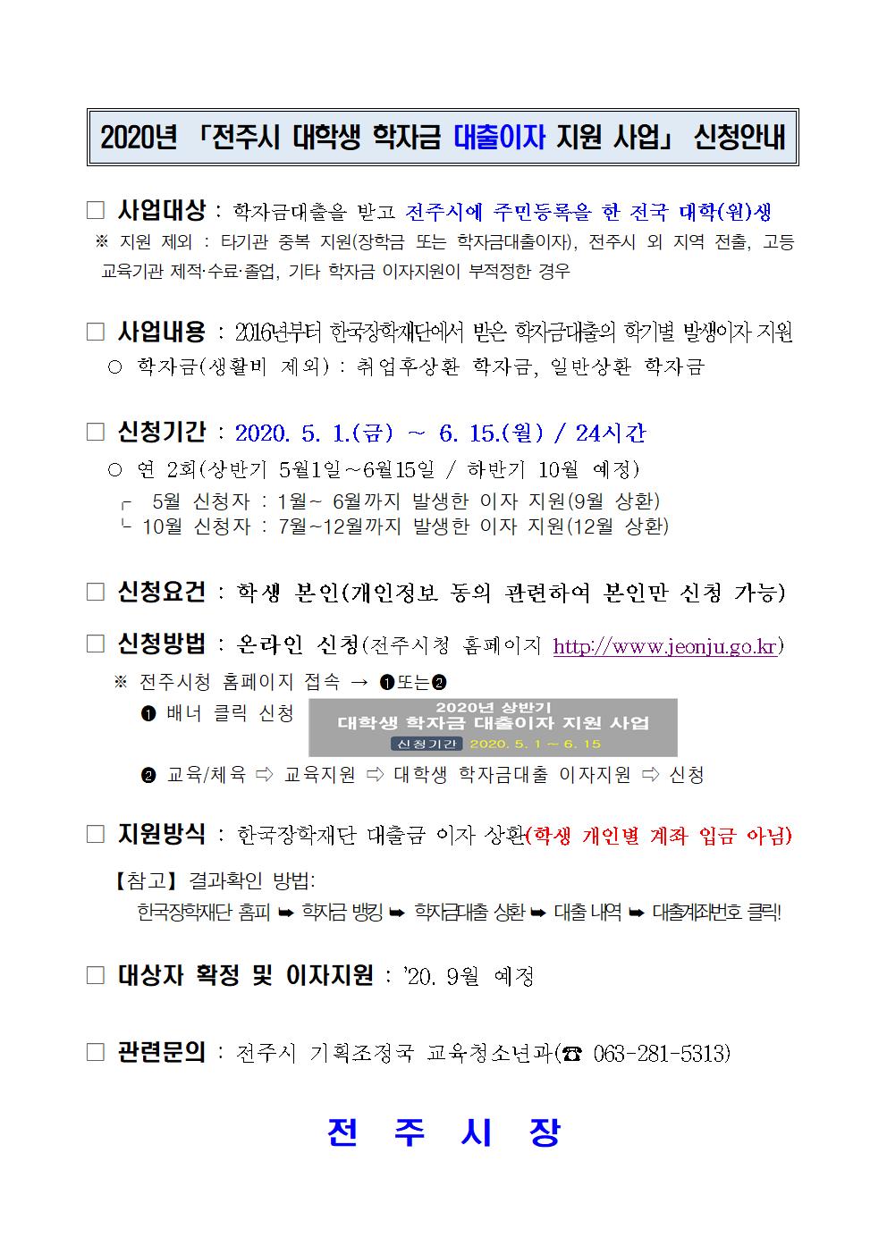 2020년 상반기 전주시 대학생 학자금대출 이자 지원 안내