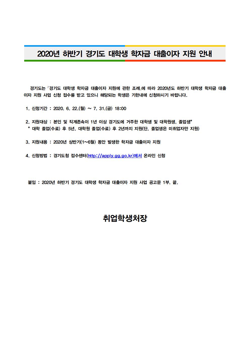 2020년 하반기 경기도 대학생 학자금 대출이자 지원 안내