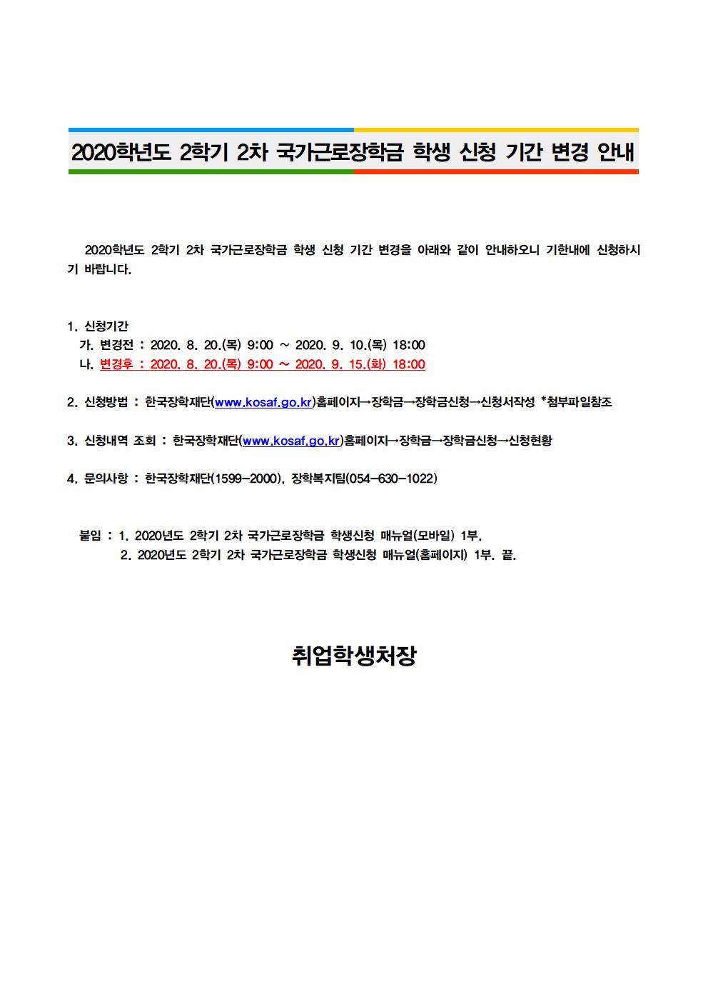 2020학년도 2학기 2차 국가근로장학금 학생 신청 기간 변경 안내