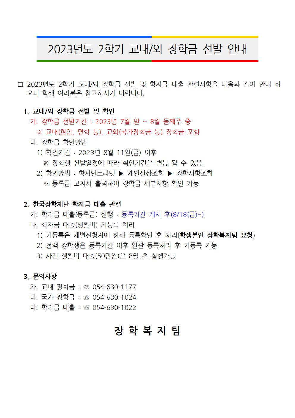 2023년도 2학기 교내외 장학금 선발 안내