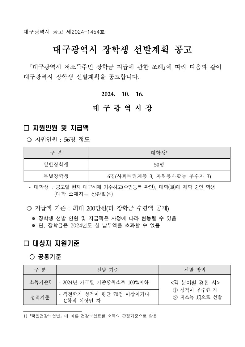 2024년 대구광역시 저소득주민 장학생 선발계획 공고문_1