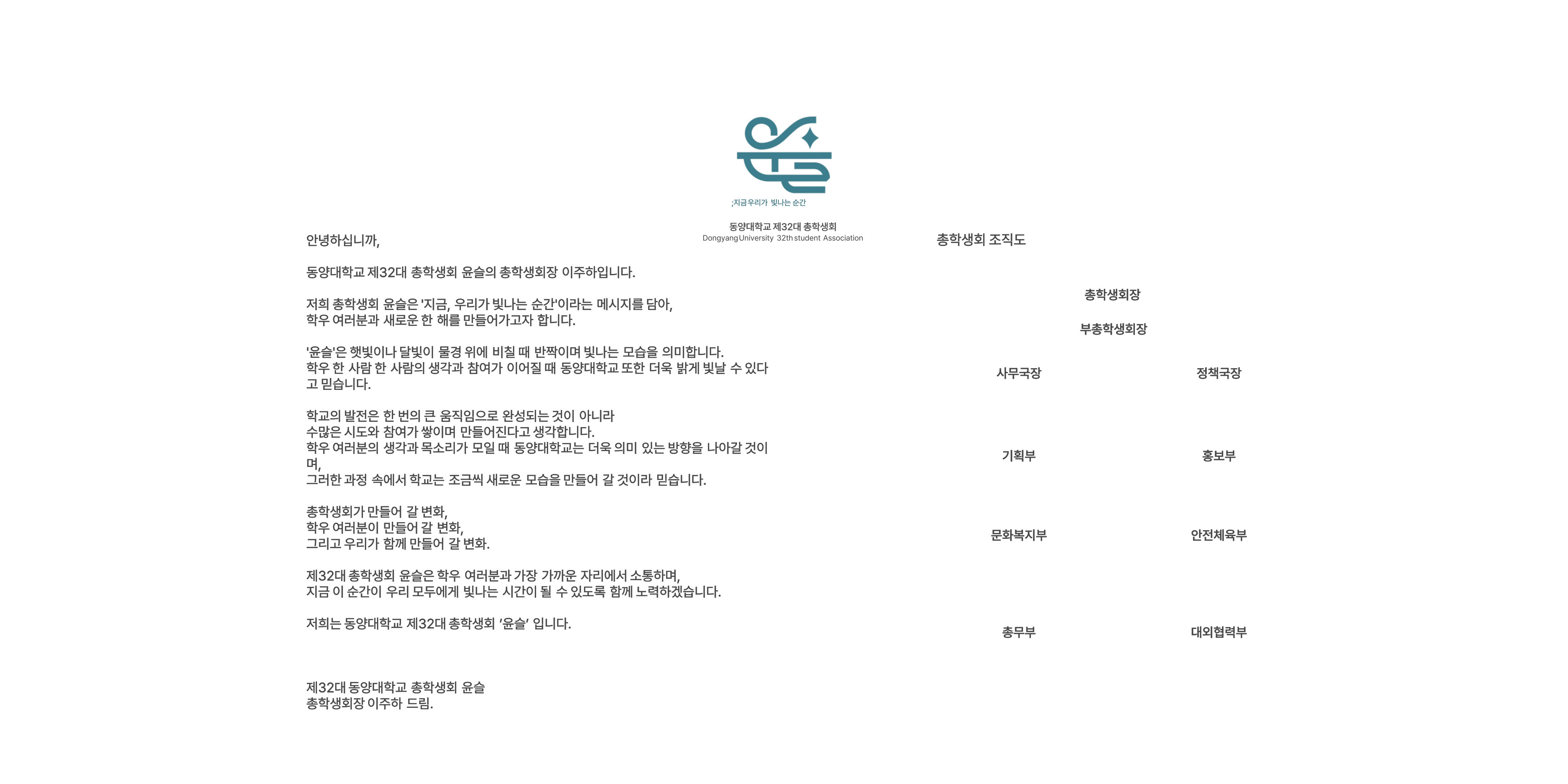 HOME > 대학생활 > 총학생회 대학생활학사일정 동양대학교 학칙 학사관련규정 학생생활관련 규정 학사안내 -수 강 -성 적 -학 적 -전 공 -증 명 -졸 업 장학/학자금제도 총학생회 동아리 안내 학생식당 주간식단표 인터넷증명발급 협약(재학생 혜택) 총학생회