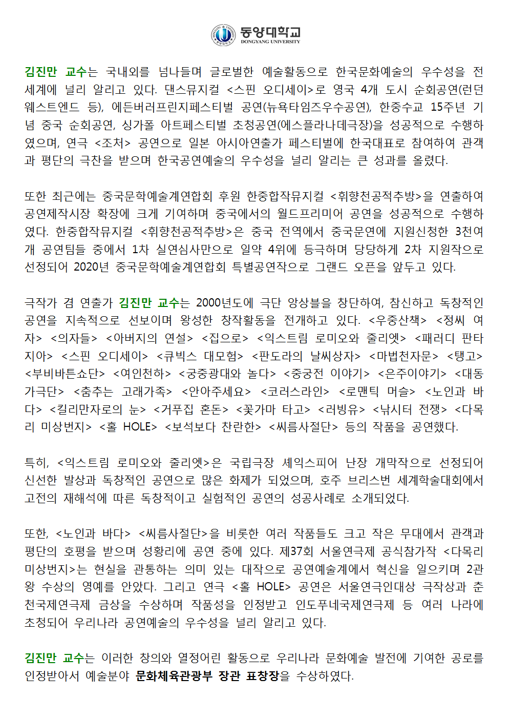 공연영상학부 김진만 교수 문화체육관광부 장관 표창장 수상003