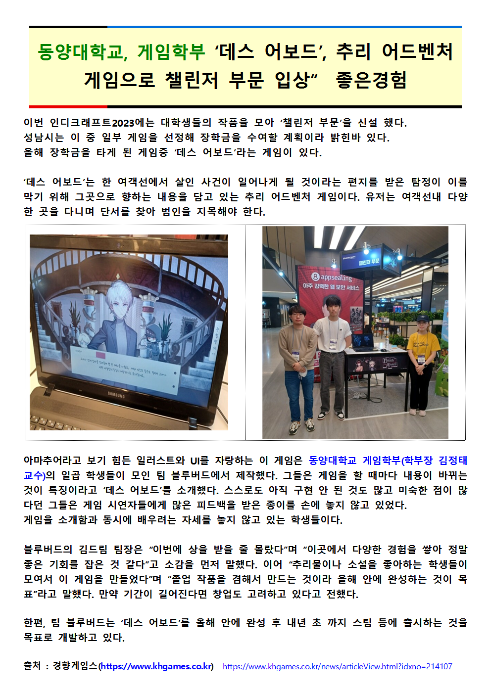 [생생라이브 게시내용] 동양대, 게임학부 ‘데스 어보드’, 추리 어드벤처 게임으로 챌린저 부문 입상“ 좋은경험001
