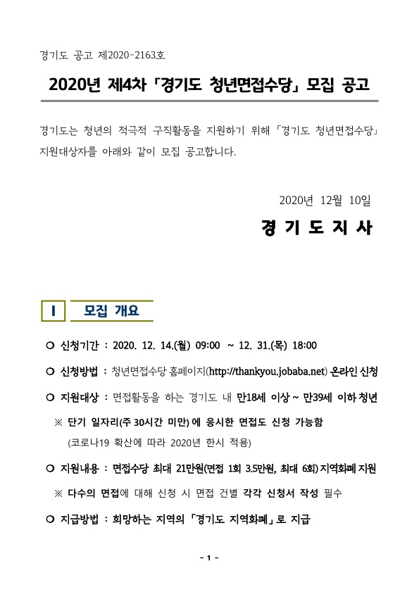 2020년 제4차 경기도 청년면접수당 모집 공고_1