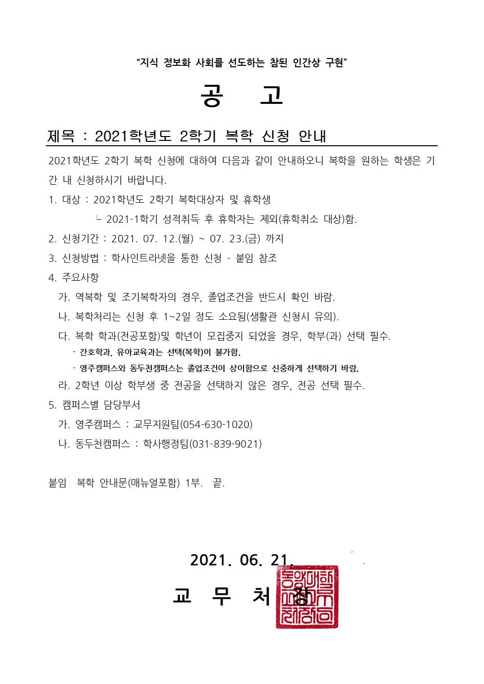 공고문_2021학년도 2학기 복학 신청 안내