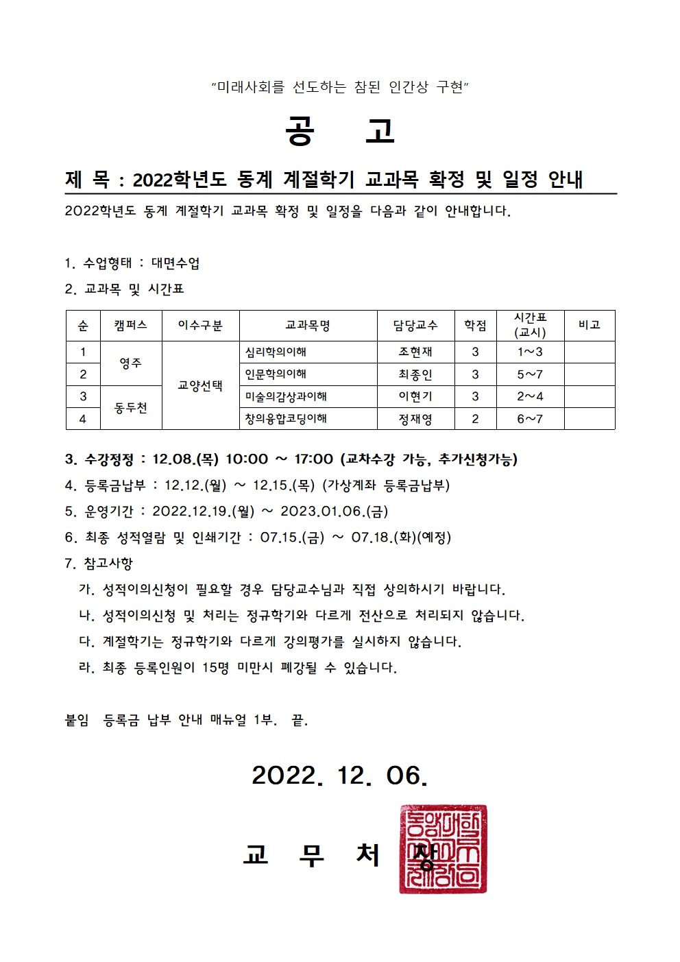 공고문_2022학년도 동계 계절학기 교과목 확정 및 일정안내001