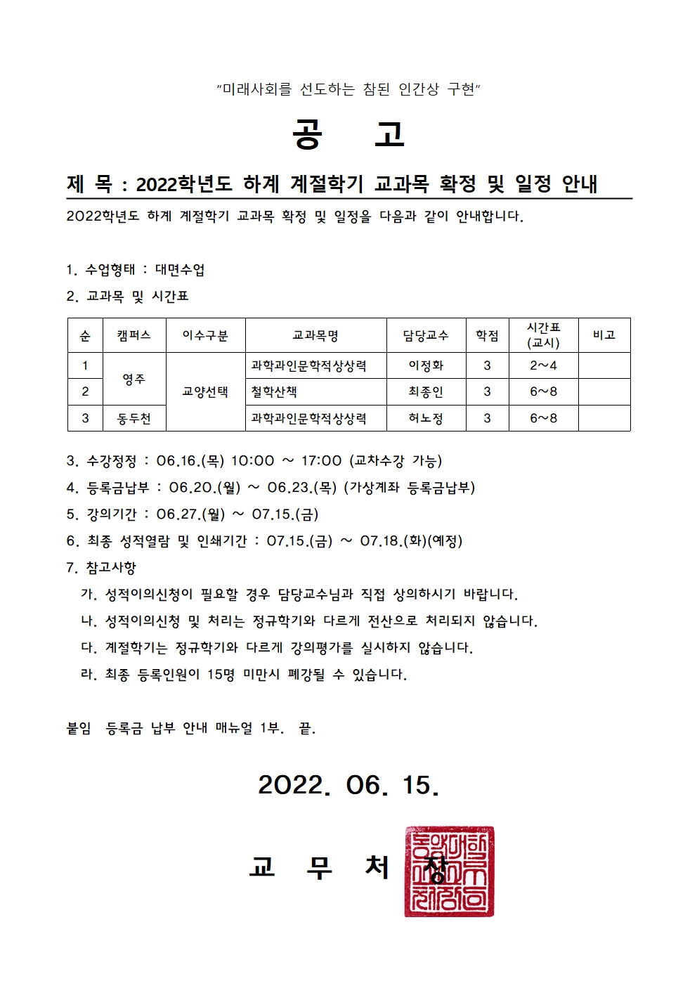 공고문_2022학년도 하계 계절학기 교과목 확정 및 일정안내001