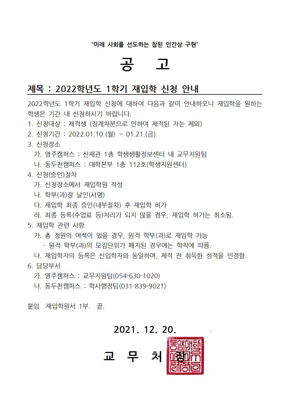 공고문_2022학년도 1학기 재입학 신청기간 안내001
