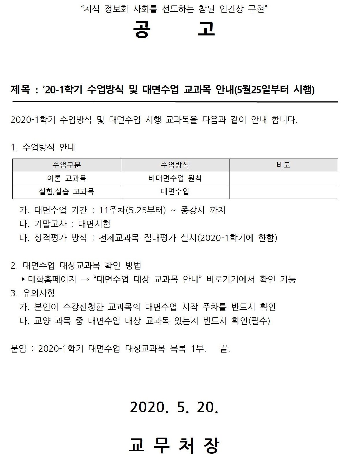 [공고] 2020-1학기 수업방식 및 대면수업 교과목 안내(5월25일부터 시행)