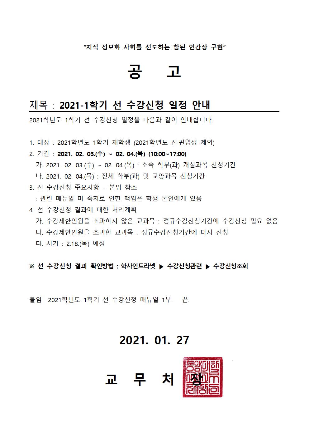 공고 2021학년도 1학기 선 수강신청 일정 안내001