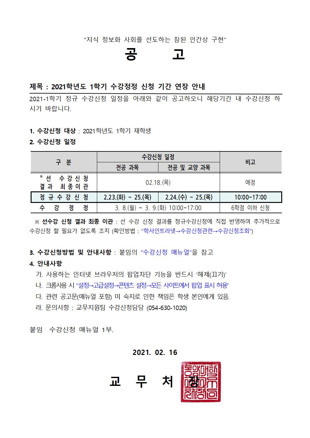 [공고] 2021학년도 1학기 정규 수강신청 안내001