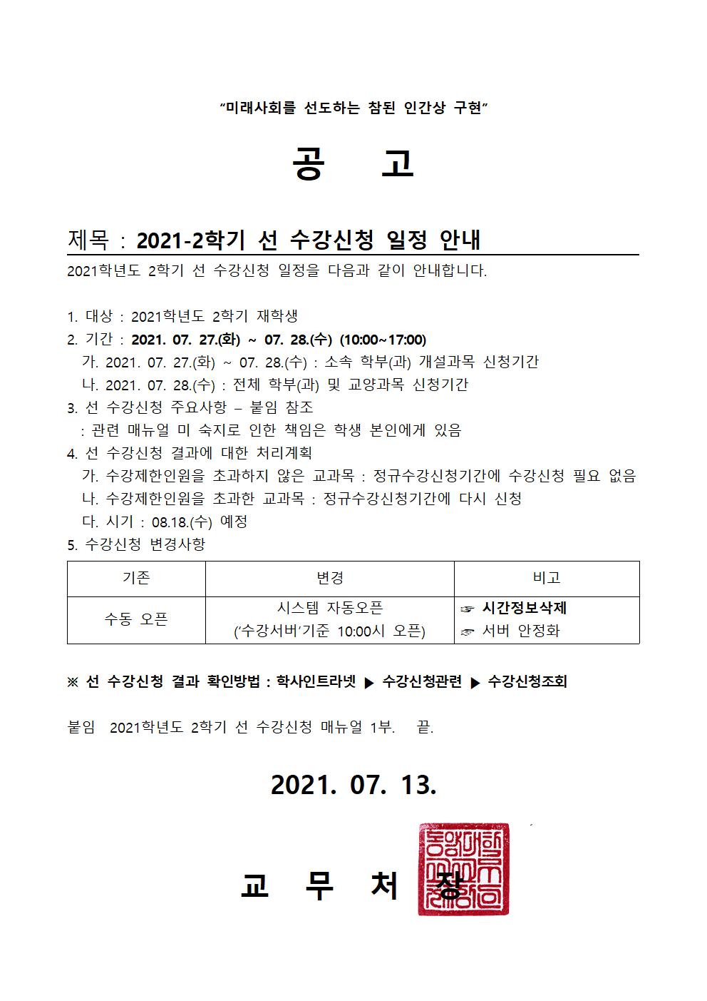 공고 2021학년도 2학기 선 수강신청 일정 안내(변경)001