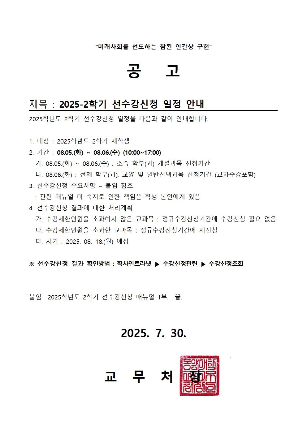 공고 2025학년도 2학기 선 수강신청 일정 안내