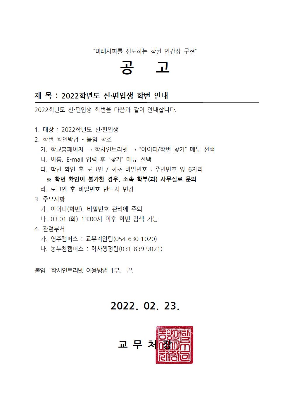 공고_2022학년도 신·편입생 학번 안내001