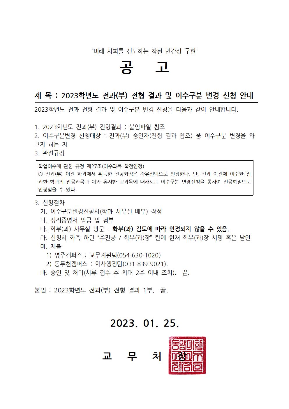 붙임2_공고문_2023학년도 전과(부) 전형 결과 및 이수구분변경신청 안내001