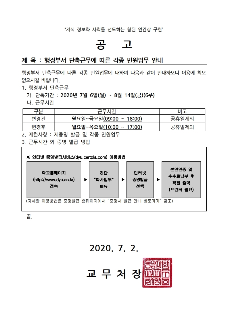 행정부서 단축근무에 따른 민원업무 안내