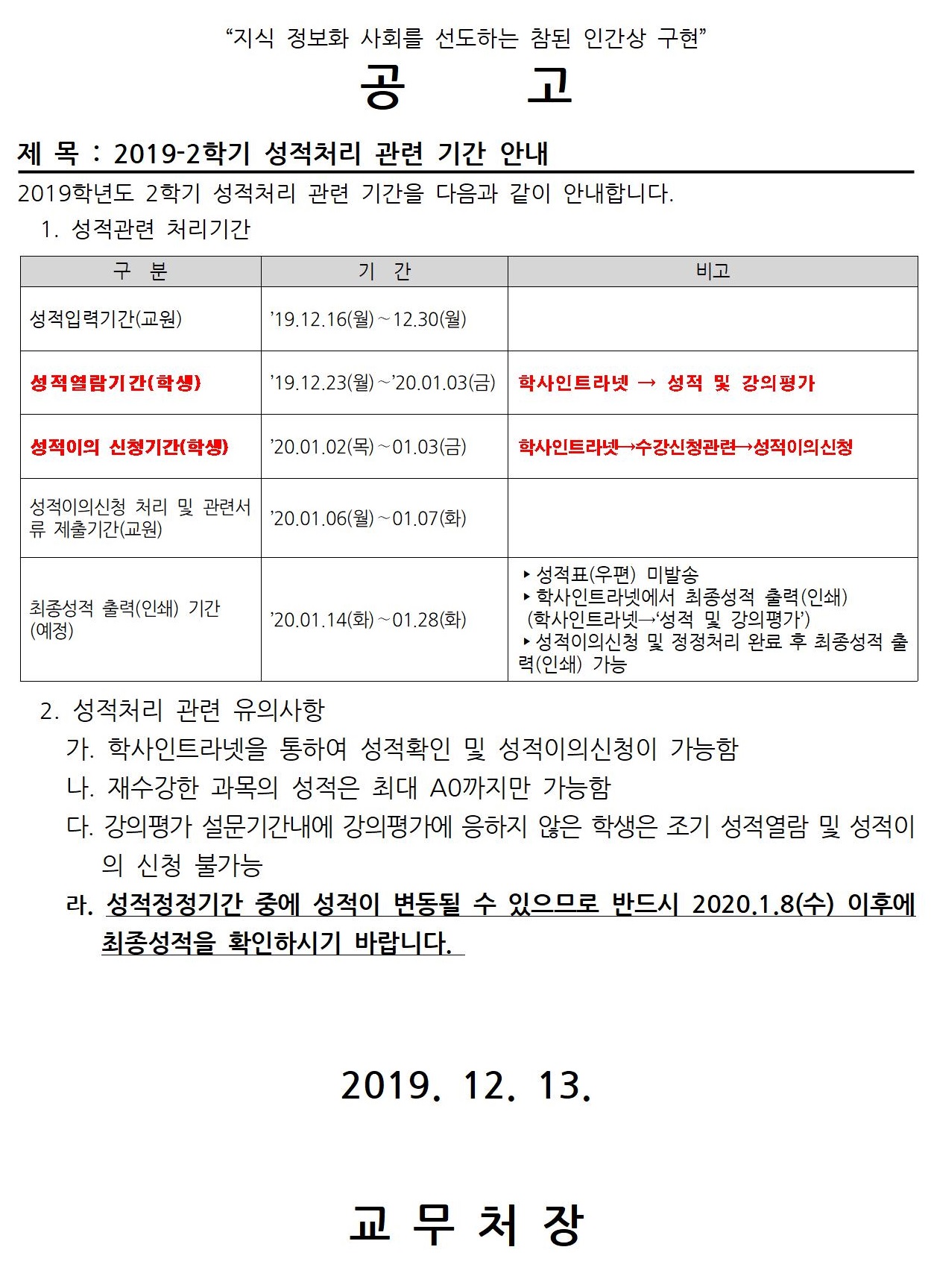 2019-2학기 성적처리 기간 안내