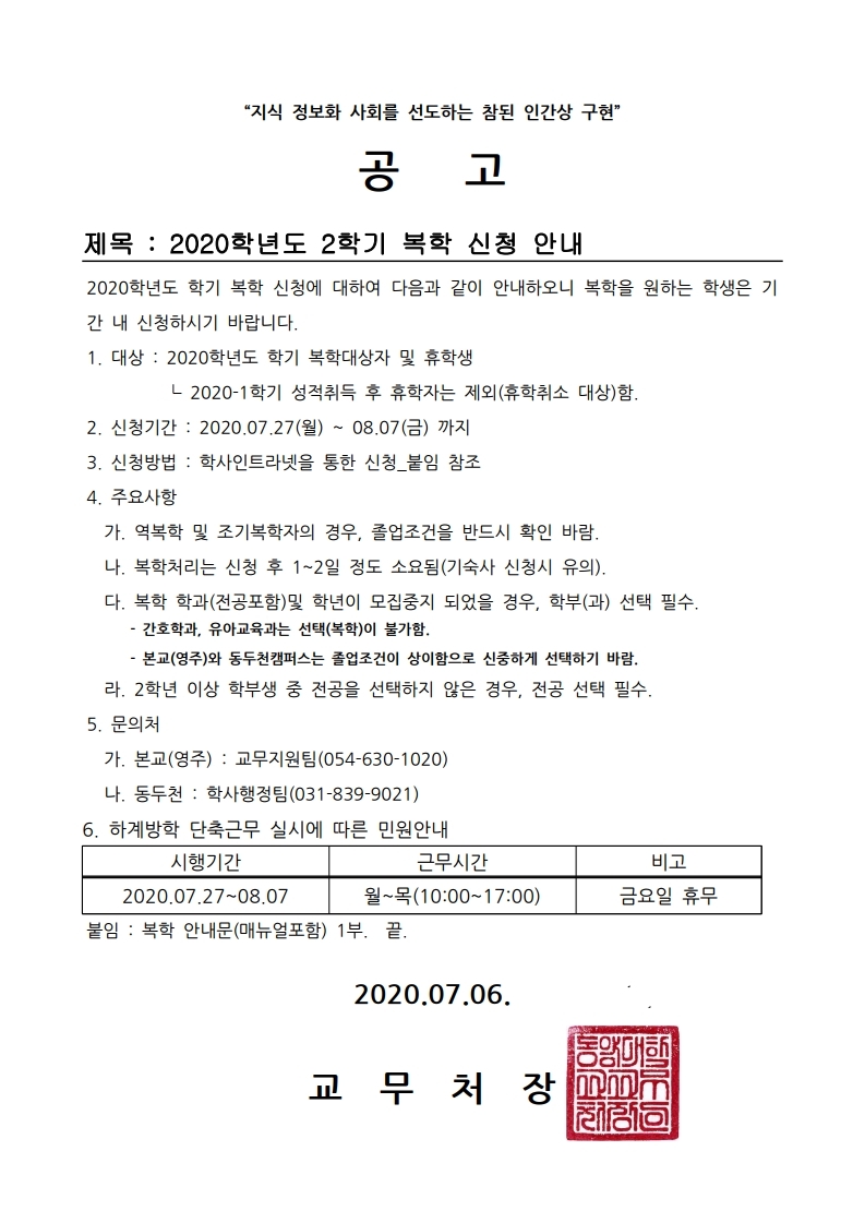 연락처 : 031-839-9114   위치 : 우) 11307 경기도 동두천시 평화로 2741 동양대학교 동두천캠퍼스