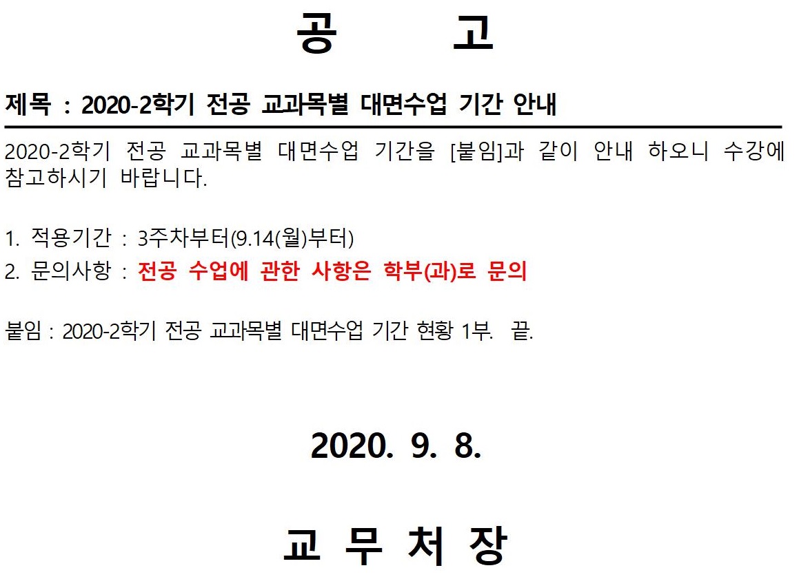 2020-2학기 전공 교과목 대면수업 기간 안내001