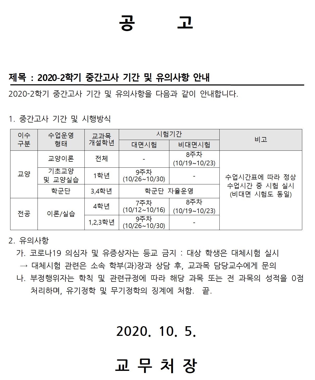 2020-2학기 중간고사 안내