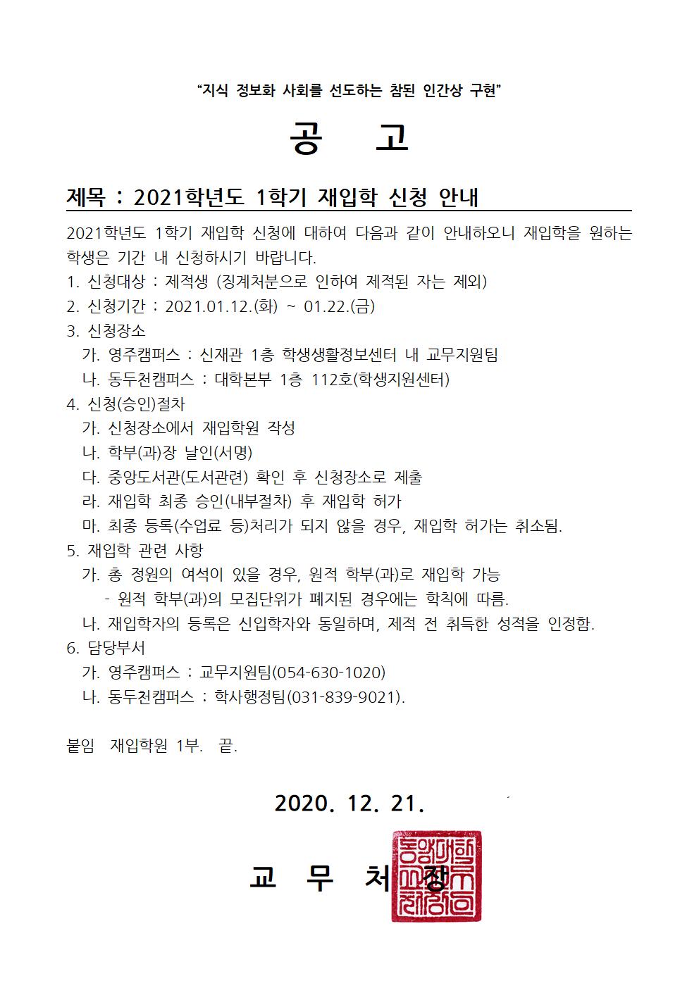 2021학년도 1학기 재입학 신청기간 안내(공고)001