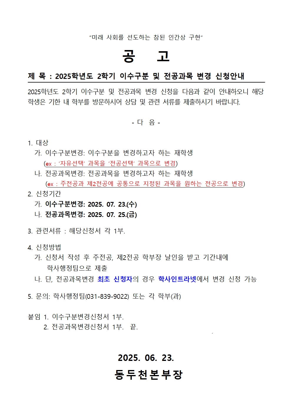 2025학년도 2학기 이수구분 및 전공과목 변경 신청안내 공고문001