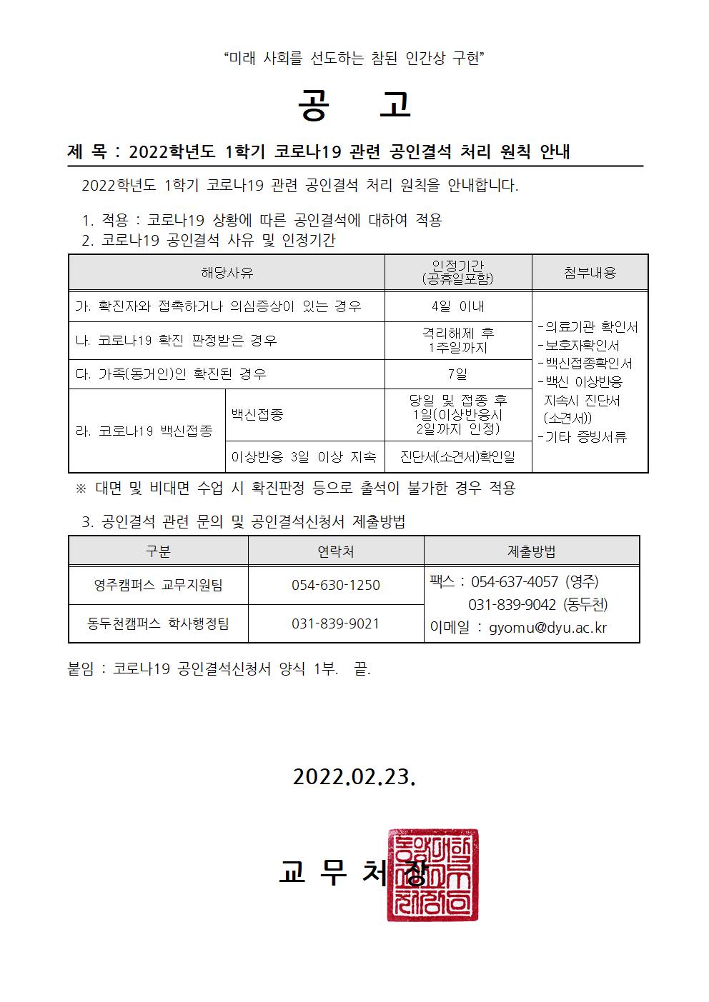 (22.02.23)공고_2022학년도 1학기 코로나 19 관련 공인결석 처리 안내001