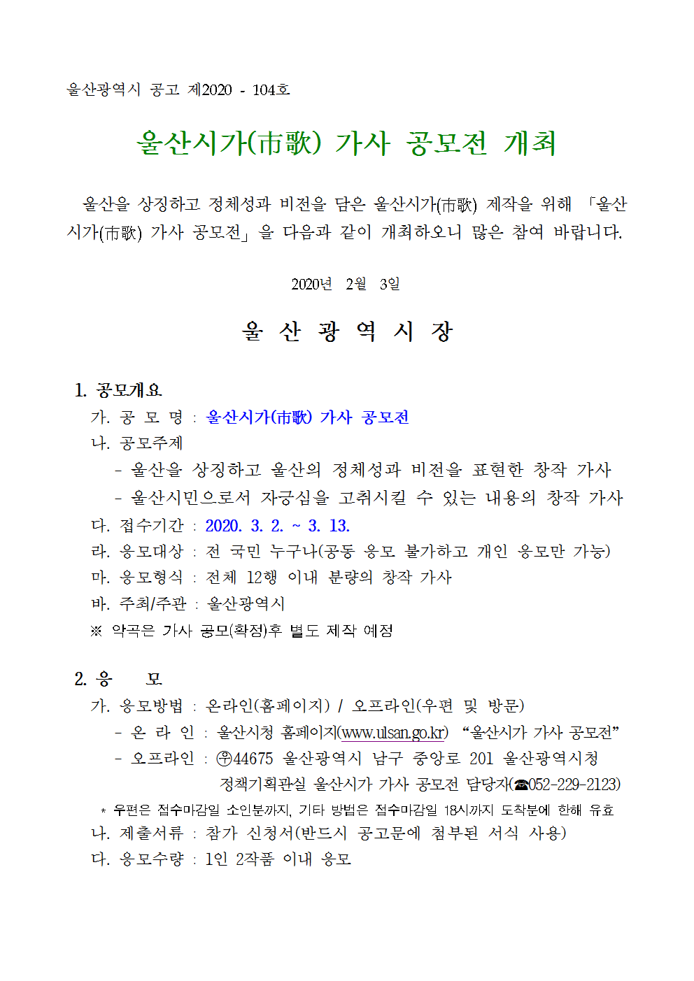 「울산시가(市歌) 가사 공모전」 공고문001